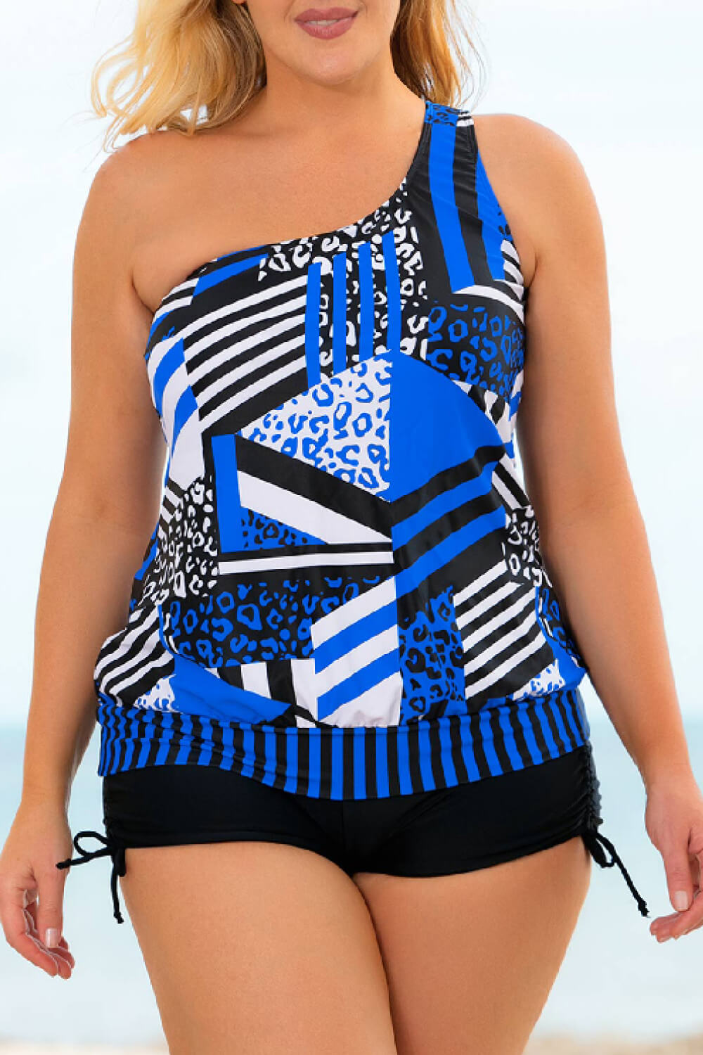 Plus Size Patchwork Tied One-Shoulder Tankini Set